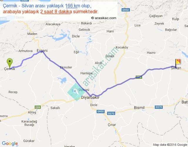 Çermik - Silvan arası yaklaşık olarak 90 km/h ile yukarıda belirtilen sürede olup, iki yerin kuş uçuşu uzaklığı (mesafesi) 135'dir. Yolculuk otobüsle 2 saat 46 dakika sürmektedir.