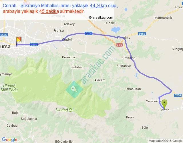 Cerrah - Şükraniye Mahallesi arası yaklaşık olarak 90 km/h ile yukarıda belirtilen sürede olup, iki yerin kuş uçuşu uzaklığı (mesafesi) 33'dir. Yolculuk otobüsle 58 dakika sürmektedir.