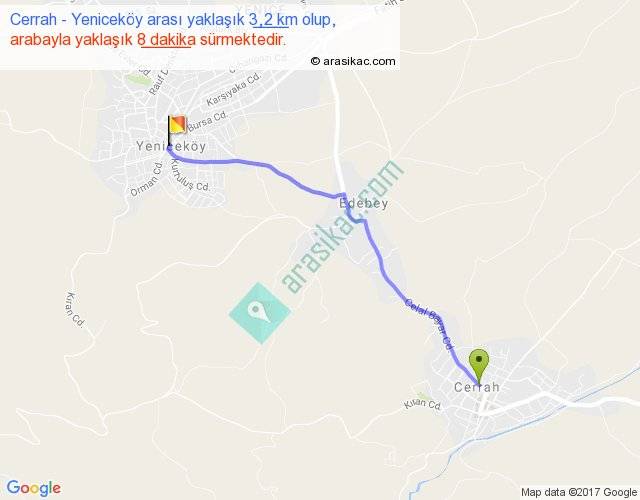 Cerrah - Yeniceköy arası yaklaşık olarak 90 km/h ile yukarıda belirtilen sürede olup, iki yerin kuş uçuşu uzaklığı (mesafesi) 3'dir. Yolculuk otobüsle 10 dakika sürmektedir.