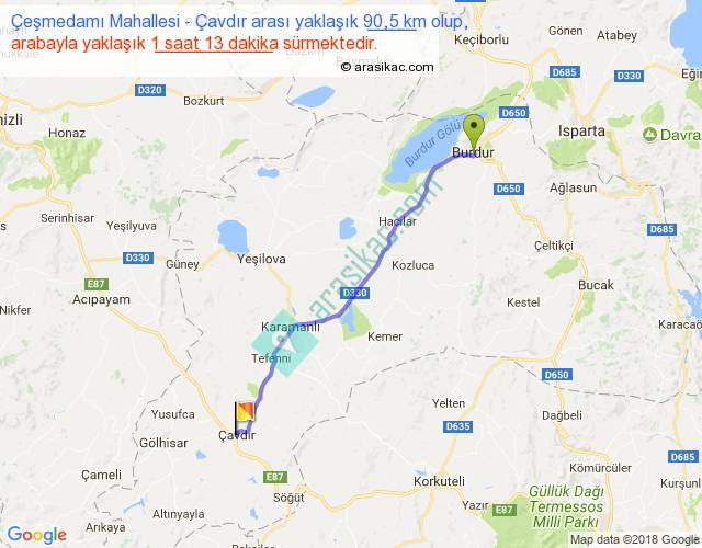 Çeşmedamı Mahallesi - Çavdır arası yaklaşık olarak 90 km/h ile yukarıda belirtilen sürede olup, iki yerin kuş uçuşu uzaklığı (mesafesi) 81'dir. Yolculuk otobüsle 1 saat 34 dakika sürmektedir.