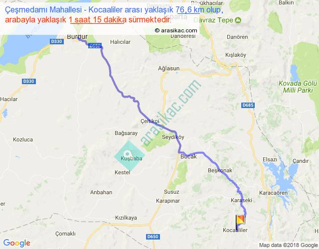 Çeşmedamı Mahallesi - Kocaaliler arası yaklaşık olarak 90 km/h ile yukarıda belirtilen sürede olup, iki yerin kuş uçuşu uzaklığı (mesafesi) 60'dir. Yolculuk otobüsle 1 saat 37 dakika sürmektedir.