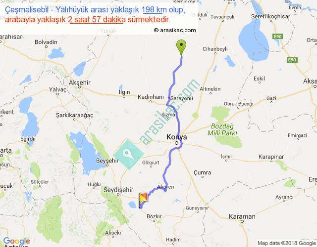 Çeşmelisebil - Yalıhüyük arası yaklaşık olarak 90 km/h ile yukarıda belirtilen sürede olup, iki yerin kuş uçuşu uzaklığı (mesafesi) 152'dir. Yolculuk otobüsle 3 saat 50 dakika sürmektedir.