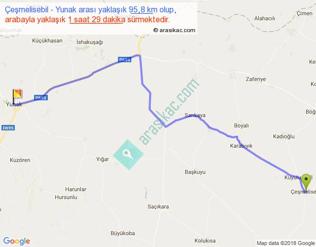Çeşmelisebil - Yunak arası yaklaşık olarak 90 km/h ile yukarıda belirtilen sürede olup, iki yerin kuş uçuşu uzaklığı (mesafesi) 73'dir. Yolculuk otobüsle 1 saat 55 dakika sürmektedir.