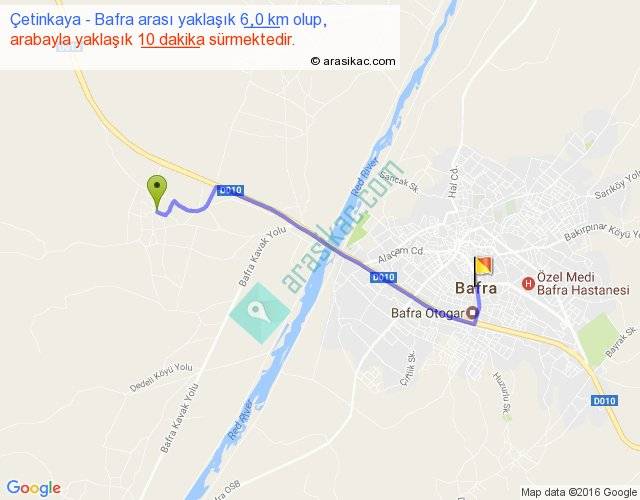 Çetinkaya - Bafra arası yaklaşık olarak 90 km/h ile yukarıda belirtilen sürede olup, iki yerin kuş uçuşu uzaklığı (mesafesi) 5'dir. Yolculuk otobüsle 13 dakika sürmektedir.