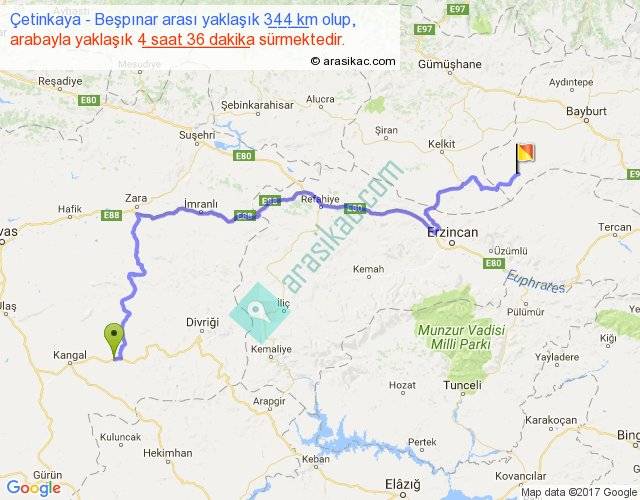 Çetinkaya - Beşpınar arası yaklaşık olarak 90 km/h ile yukarıda belirtilen sürede olup, iki yerin kuş uçuşu uzaklığı (mesafesi) 208'dir. Yolculuk otobüsle 5 saat 58 dakika sürmektedir.