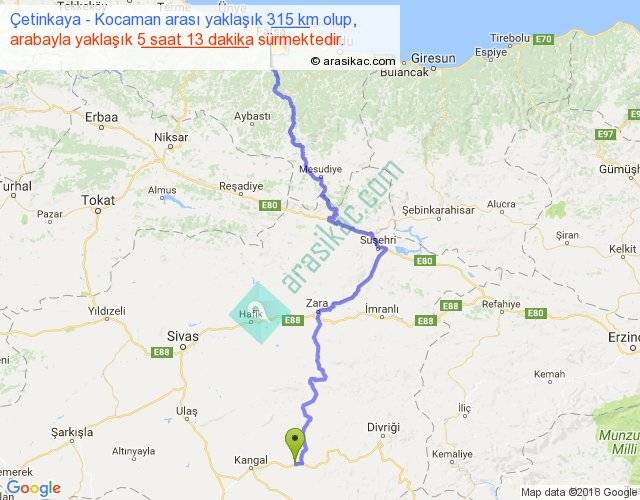 Çetinkaya - Kocaman arası yaklaşık olarak 90 km/h ile yukarıda belirtilen sürede olup, iki yerin kuş uçuşu uzaklığı (mesafesi) 185'dir. Yolculuk otobüsle 6 saat 46 dakika sürmektedir.