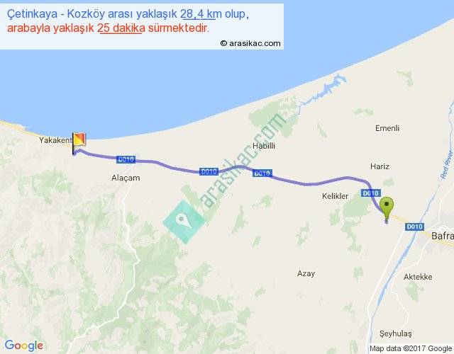Çetinkaya - Kozköy arası yaklaşık olarak 90 km/h ile yukarıda belirtilen sürede olup, iki yerin kuş uçuşu uzaklığı (mesafesi) 26'dir. Yolculuk otobüsle 32 dakika sürmektedir.
