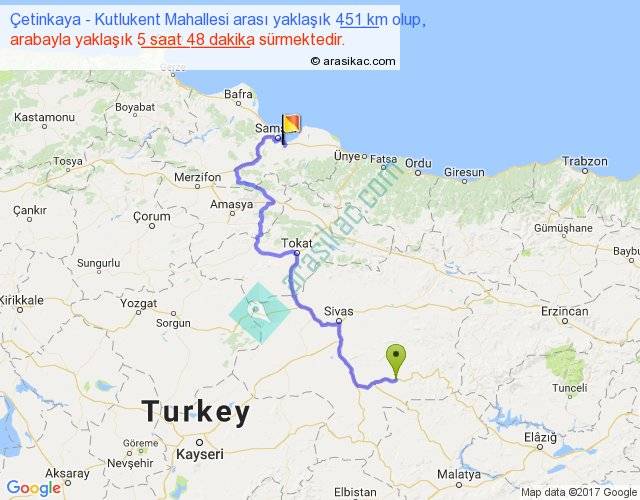 Çetinkaya - Kutlukent Mahallesi arası yaklaşık olarak 90 km/h ile yukarıda belirtilen sürede olup, iki yerin kuş uçuşu uzaklığı (mesafesi) 240'dir. Yolculuk otobüsle 7 saat 32 dakika sürmektedir.