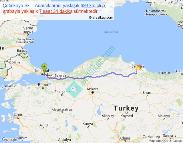 Çetinkaya Sk. - Asarcık arası yaklaşık olarak 90 km/h ile yukarıda belirtilen sürede olup, iki yerin kuş uçuşu uzaklığı (mesafesi) 589'dir. Eğer belirtilen yerler arasında uçak seferi var ise bu süre uçakla 54 dakika'ya kadar düşebilir. Yolculuk otobüsle 9 saat 46 dakika sürmektedir.