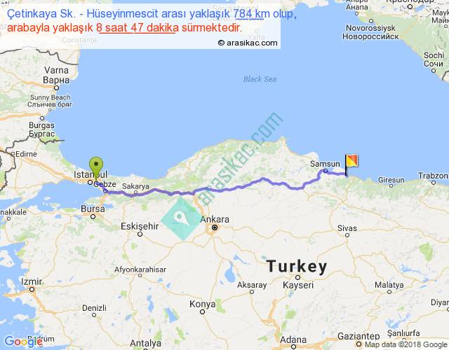 Çetinkaya Sk. - Hüseyinmescit arası yaklaşık olarak 90 km/h ile yukarıda belirtilen sürede olup, iki yerin kuş uçuşu uzaklığı (mesafesi) 653'dir. Eğer belirtilen yerler arasında uçak seferi var ise bu süre uçakla 1 saat 00 dakika'ya kadar düşebilir. Yolculuk otobüsle 11 saat 25 dakika sürmektedir.