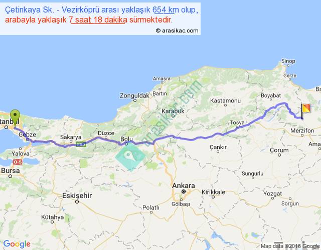 Çetinkaya Sk. - Vezirköprü arası yaklaşık olarak 90 km/h ile yukarıda belirtilen sürede olup, iki yerin kuş uçuşu uzaklığı (mesafesi) 525'dir. Eğer belirtilen yerler arasında uçak seferi var ise bu süre uçakla 48 dakika'ya kadar düşebilir. Yolculuk otobüsle 9 saat 29 dakika sürmektedir.