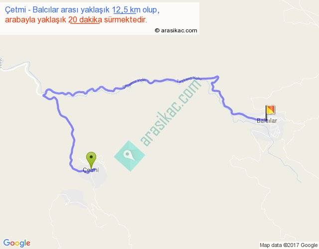 Çetmi - Balcılar arası yaklaşık olarak 90 km/h ile yukarıda belirtilen sürede olup, iki yerin kuş uçuşu uzaklığı (mesafesi) 6'dir. Yolculuk otobüsle 26 dakika sürmektedir.