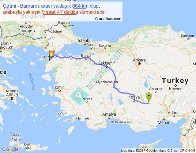 Çetmi - Barbaros arası yaklaşık olarak 90 km/h ile yukarıda belirtilen sürede olup, iki yerin kuş uçuşu uzaklığı (mesafesi) 668'dir. Eğer belirtilen yerler arasında uçak seferi var ise bu süre uçakla 1 saat 01 dakika'ya kadar düşebilir. Yolculuk otobüsle 12 saat 43 dakika sürmektedir.