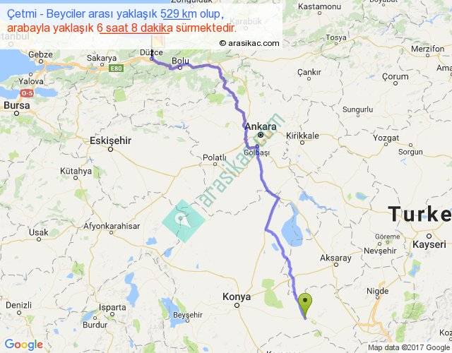 Çetmi - Beyciler arası yaklaşık olarak 90 km/h ile yukarıda belirtilen sürede olup, iki yerin kuş uçuşu uzaklığı (mesafesi) 403'dir. Eğer belirtilen yerler arasında uçak seferi var ise bu süre uçakla 37 dakika'ya kadar düşebilir. Yolculuk otobüsle 7 saat 58 dakika sürmektedir.