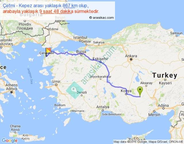 Çetmi - Kepez arası yaklaşık olarak 90 km/h ile yukarıda belirtilen sürede olup, iki yerin kuş uçuşu uzaklığı (mesafesi) 669'dir. Eğer belirtilen yerler arasında uçak seferi var ise bu süre uçakla 1 saat 01 dakika'ya kadar düşebilir. Yolculuk otobüsle 12 saat 44 dakika sürmektedir.