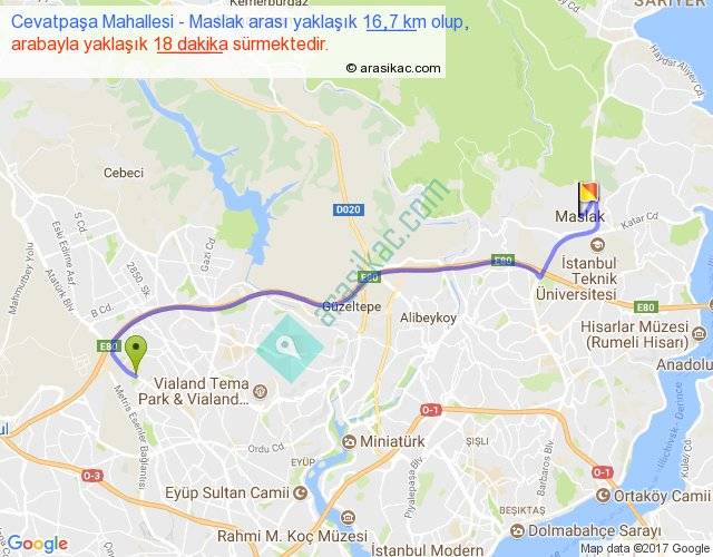 Eğer Cevatpaşa Mahallesi Maslak arası ne kadar yakar (benzin/mazot) diyorsanız, kilometrede 3 ₺ yakan bir aracınız var ise 48, km'de 4 ₺ yakan bir aracınız var ise 64, km'de 5 ₺ yakan bir aracınız var ise 80 ile bu yolculuğu tamamlayabilirsiniz.