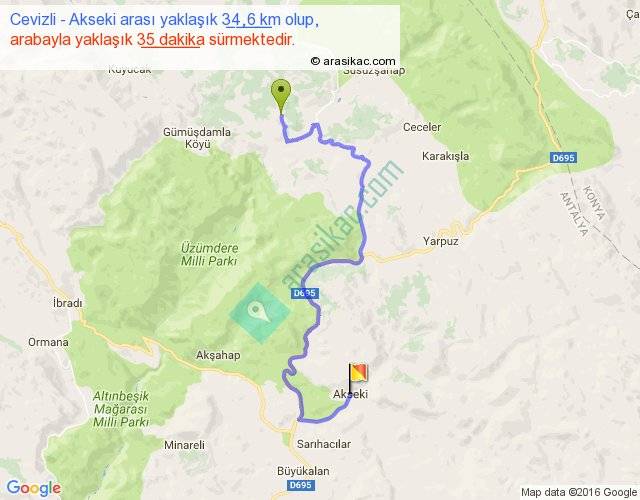 Cevizli - Akseki arası yaklaşık olarak 90 km/h ile yukarıda belirtilen sürede olup, iki yerin kuş uçuşu uzaklığı (mesafesi) 17'dir. Yolculuk otobüsle 45 dakika sürmektedir.