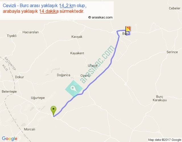 Cevizli - Burc arası yaklaşık olarak 90 km/h ile yukarıda belirtilen sürede olup, iki yerin kuş uçuşu uzaklığı (mesafesi) 12'dir. Yolculuk otobüsle 18 dakika sürmektedir.