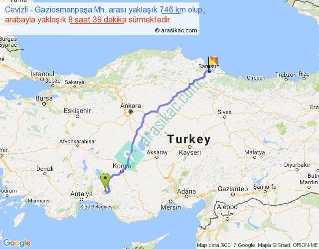 Cevizli - Gaziosmanpaşa Mh. arası yaklaşık olarak 90 km/h ile yukarıda belirtilen sürede olup, iki yerin kuş uçuşu uzaklığı (mesafesi) 597'dir. Eğer belirtilen yerler arasında uçak seferi var ise bu süre uçakla 55 dakika'ya kadar düşebilir. Yolculuk otobüsle 11 saat 14 dakika sürmektedir.