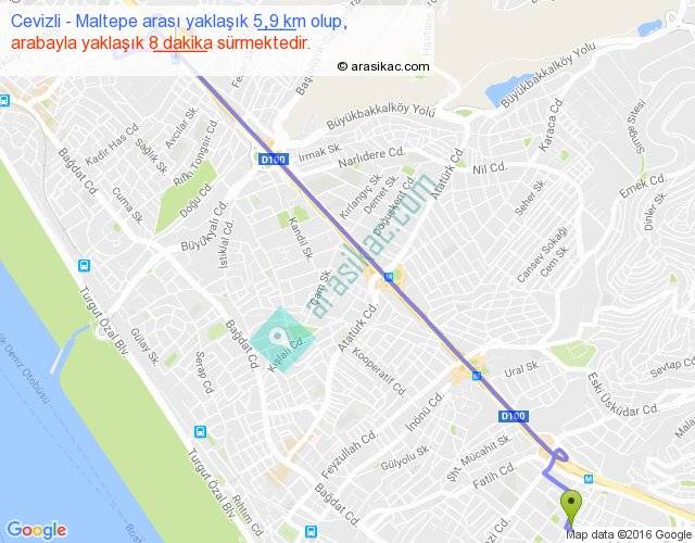Cevizli - Maltepe arası yaklaşık olarak 90 km/h ile yukarıda belirtilen sürede olup, iki yerin kuş uçuşu uzaklığı (mesafesi) 4'dir. Yolculuk otobüsle 10 dakika sürmektedir.