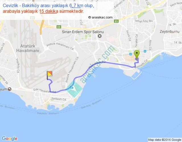 Cevizlik - Bakirköy arası yaklaşık olarak 90 km/h ile yukarıda belirtilen sürede olup, iki yerin kuş uçuşu uzaklığı (mesafesi) 5'dir. Yolculuk otobüsle 19 dakika sürmektedir.