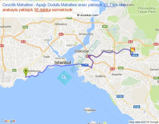 Cevizlik Mahallesi - Aşağı Dudullu Mahallesi arası yaklaşık olarak 90 km/h ile yukarıda belirtilen sürede olup, iki yerin kuş uçuşu uzaklığı (mesafesi) 25'dir. Yolculuk otobüsle 46 dakika sürmektedir.