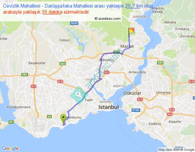 Cevizlik Mahallesi - Darüşşafaka Mahallesi arası yaklaşık olarak 90 km/h ile yukarıda belirtilen sürede olup, iki yerin kuş uçuşu uzaklığı (mesafesi) 21'dir. Yolculuk otobüsle 45 dakika sürmektedir.