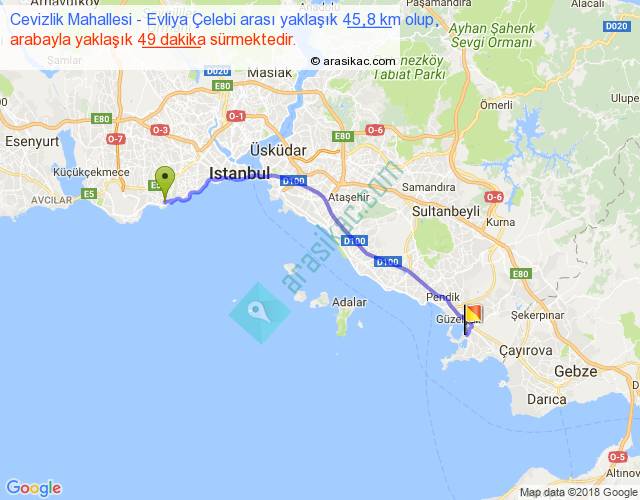 Cevizlik Mahallesi - Evliya Çelebi arası yaklaşık olarak 90 km/h ile yukarıda belirtilen sürede olup, iki yerin kuş uçuşu uzaklığı (mesafesi) 38'dir. Yolculuk otobüsle 1 saat 3 dakika sürmektedir.