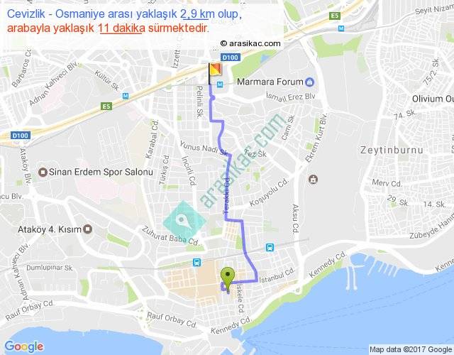 Cevizlik - Osmaniye arası yaklaşık olarak 90 km/h ile yukarıda belirtilen sürede olup, iki yerin kuş uçuşu uzaklığı (mesafesi) 2'dir. Yolculuk otobüsle 14 dakika sürmektedir.