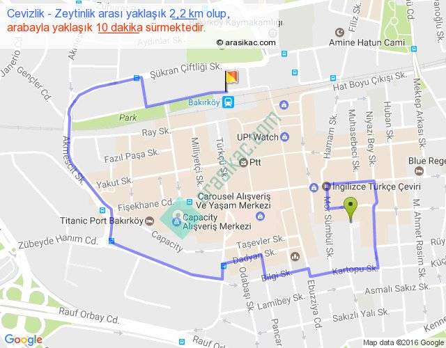 Cevizlik - Zeytinlik arası yaklaşık olarak 90 km/h ile yukarıda belirtilen sürede olup, iki yerin kuş uçuşu uzaklığı (mesafesi) 0'dir. Yolculuk otobüsle 13 dakika sürmektedir.