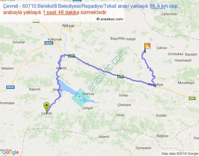 Çevreli - 60710 Bereketli Belediyesi Reşadiye Tokat arası yaklaşık olarak 90 km/h ile yukarıda belirtilen sürede olup, iki yerin kuş uçuşu uzaklığı (mesafesi) 43'dir. Yolculuk otobüsle 2 saat 20 dakika sürmektedir.