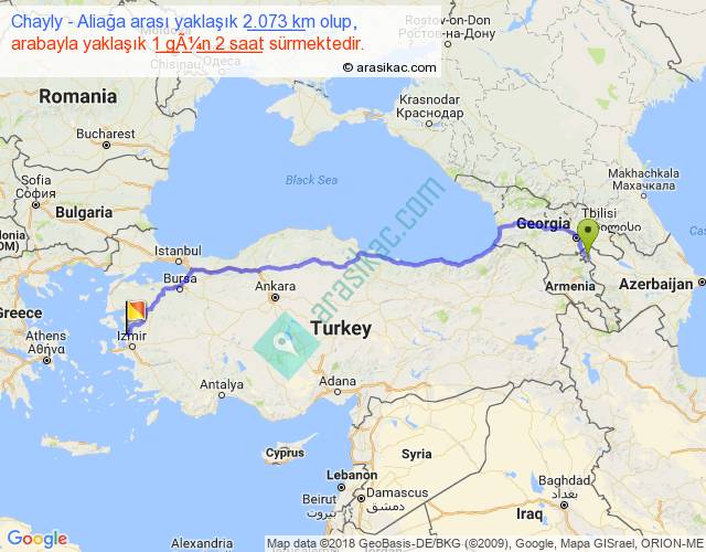 Chayly - Aliağa arası yaklaşık olarak 90 km/h ile yukarıda belirtilen sürede olup, iki yerin kuş uçuşu uzaklığı (mesafesi) 1572'dir. Eğer belirtilen yerler arasında uçak seferi var ise bu süre uçakla 2 saat 25 dakika'ya kadar düşebilir. Yolculuk otobüsle 1 gün 9 saat sürmektedir.