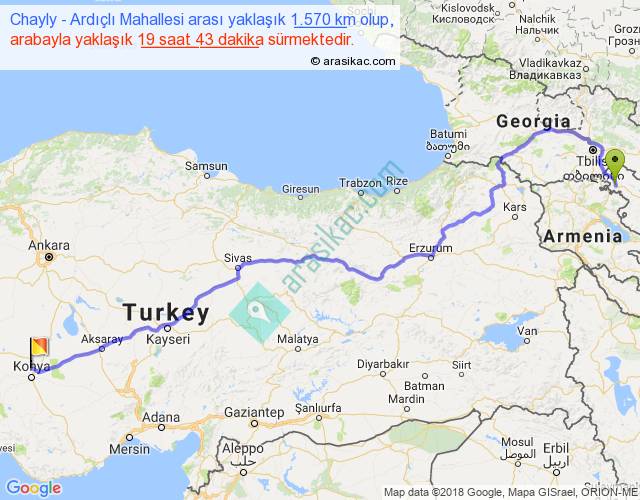 Chayly - Ardıçlı Mahallesi arası yaklaşık olarak 90 km/h ile yukarıda belirtilen sürede olup, iki yerin kuş uçuşu uzaklığı (mesafesi) 1142'dir. Eğer belirtilen yerler arasında uçak seferi var ise bu süre uçakla 1 saat 45 dakika'ya kadar düşebilir. Yolculuk otobüsle 1 gün 1 saat sürmektedir.