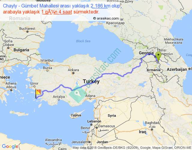 Chayly - Gümbet Mahallesi arası yaklaşık olarak 90 km/h ile yukarıda belirtilen sürede olup, iki yerin kuş uçuşu uzaklığı (mesafesi) 1599'dir. Eğer belirtilen yerler arasında uçak seferi var ise bu süre uçakla 2 saat 27 dakika'ya kadar düşebilir. Yolculuk otobüsle 1 gün 12 saat sürmektedir.