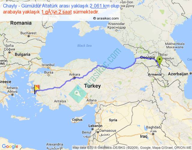 Chayly - Gümüldür Atatürk arası yaklaşık olarak 90 km/h ile yukarıda belirtilen sürede olup, iki yerin kuş uçuşu uzaklığı (mesafesi) 1591'dir. Eğer belirtilen yerler arasında uçak seferi var ise bu süre uçakla 2 saat 26 dakika'ya kadar düşebilir. Yolculuk otobüsle 1 gün 9 saat sürmektedir.