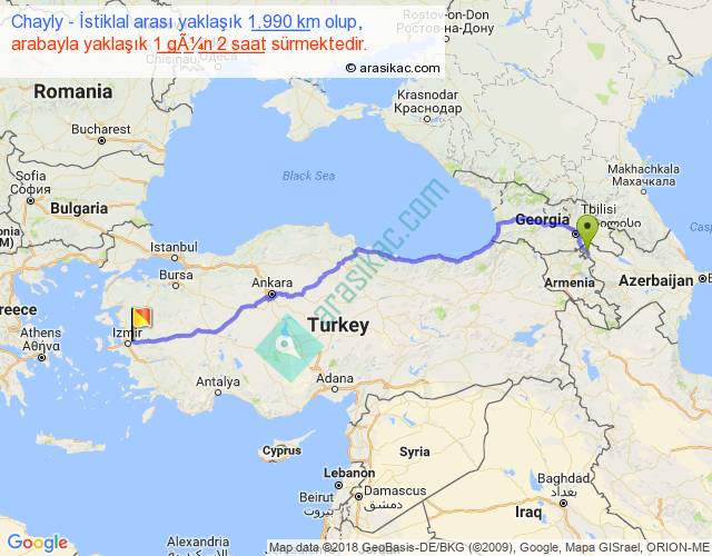 Chayly - İstiklal arası yaklaşık olarak 90 km/h ile yukarıda belirtilen sürede olup, iki yerin kuş uçuşu uzaklığı (mesafesi) 1549'dir. Eğer belirtilen yerler arasında uçak seferi var ise bu süre uçakla 2 saat 22 dakika'ya kadar düşebilir. Yolculuk otobüsle 1 gün 9 saat sürmektedir.