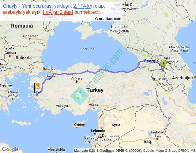 Chayly - Yenifoca arası yaklaşık olarak 90 km/h ile yukarıda belirtilen sürede olup, iki yerin kuş uçuşu uzaklığı (mesafesi) 1585'dir. Eğer belirtilen yerler arasında uçak seferi var ise bu süre uçakla 2 saat 26 dakika'ya kadar düşebilir. Yolculuk otobüsle 1 gün 9 saat sürmektedir.