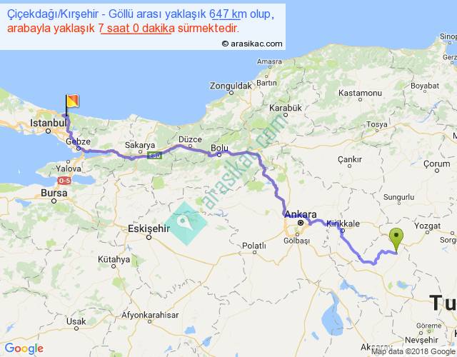 Çiçekdağı Kırşehir - Göllü arası yaklaşık olarak 90 km/h ile yukarıda belirtilen sürede olup, iki yerin kuş uçuşu uzaklığı (mesafesi) 461'dir. Eğer belirtilen yerler arasında uçak seferi var ise bu süre uçakla 42 dakika'ya kadar düşebilir. Yolculuk otobüsle 9 saat 6 dakika sürmektedir.