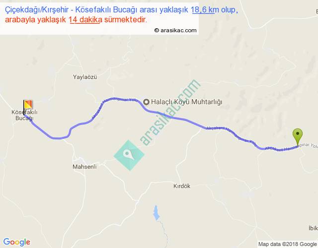Çiçekdağı Kırşehir - Kösefakılı Bucağı arası yaklaşık olarak 90 km/h ile yukarıda belirtilen sürede olup, iki yerin kuş uçuşu uzaklığı (mesafesi) 16'dir. Yolculuk otobüsle 18 dakika sürmektedir.