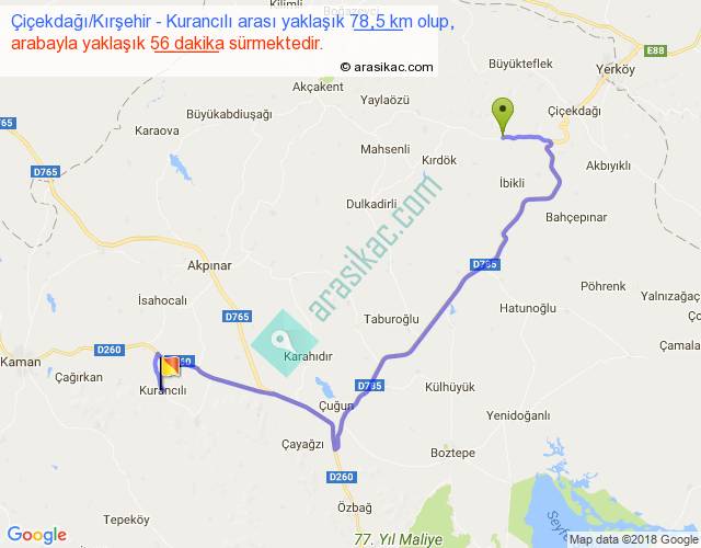 Çiçekdağı Kırşehir - Kurancılı arası yaklaşık olarak 90 km/h ile yukarıda belirtilen sürede olup, iki yerin kuş uçuşu uzaklığı (mesafesi) 45'dir. Yolculuk otobüsle 1 saat 12 dakika sürmektedir.