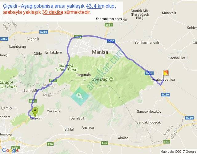 Çiçekli - Aşağıçobanisa arası yaklaşık olarak 90 km/h ile yukarıda belirtilen sürede olup, iki yerin kuş uçuşu uzaklığı (mesafesi) 26'dir. Yolculuk otobüsle 50 dakika sürmektedir.