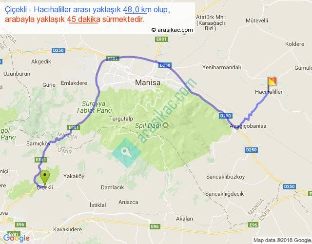 Çiçekli - Hacıhaliller arası yaklaşık olarak 90 km/h ile yukarıda belirtilen sürede olup, iki yerin kuş uçuşu uzaklığı (mesafesi) 30'dir. Yolculuk otobüsle 58 dakika sürmektedir.