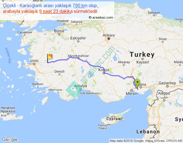 Çiçekli - Karaoğlanlı arası yaklaşık olarak 90 km/h ile yukarıda belirtilen sürede olup, iki yerin kuş uçuşu uzaklığı (mesafesi) 628'dir. Eğer belirtilen yerler arasında uçak seferi var ise bu süre uçakla 57 dakika'ya kadar düşebilir. Yolculuk otobüsle 12 saat 11 dakika sürmektedir.