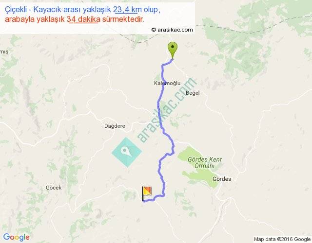 Çiçekli - Kayacık arası yaklaşık olarak 90 km/h ile yukarıda belirtilen sürede olup, iki yerin kuş uçuşu uzaklığı (mesafesi) 18'dir. Yolculuk otobüsle 44 dakika sürmektedir.