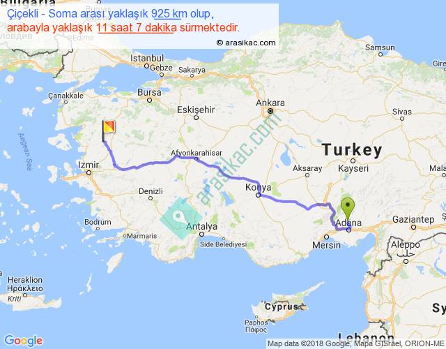 Çiçekli - Soma arası yaklaşık olarak 90 km/h ile yukarıda belirtilen sürede olup, iki yerin kuş uçuşu uzaklığı (mesafesi) 705'dir. Eğer belirtilen yerler arasında uçak seferi var ise bu süre uçakla 1 saat 05 dakika'ya kadar düşebilir. Yolculuk otobüsle 14 saat 27 dakika sürmektedir.