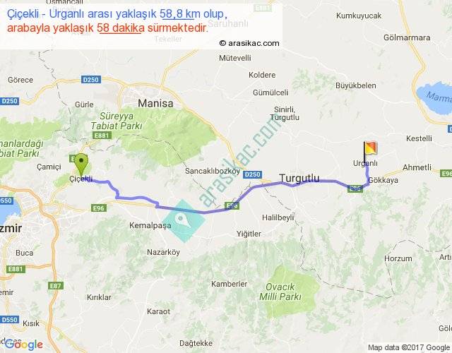 Çiçekli - Urganlı arası yaklaşık olarak 90 km/h ile yukarıda belirtilen sürede olup, iki yerin kuş uçuşu uzaklığı (mesafesi) 48'dir. Yolculuk otobüsle 1 saat 15 dakika sürmektedir.