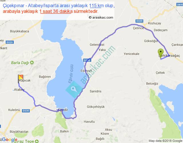 Çiçekpınar - Atabey Isparta arası yaklaşık olarak 90 km/h ile yukarıda belirtilen sürede olup, iki yerin kuş uçuşu uzaklığı (mesafesi) 60'dir. Yolculuk otobüsle 2 saat 4 dakika sürmektedir.