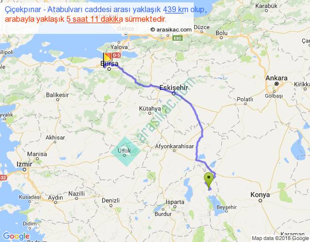 Çiçekpınar - Atabulvarı caddesi arası yaklaşık olarak 90 km/h ile yukarıda belirtilen sürede olup, iki yerin kuş uçuşu uzaklığı (mesafesi) 313'dir. Eğer belirtilen yerler arasında uçak seferi var ise bu süre uçakla 28 dakika'ya kadar düşebilir. Yolculuk otobüsle 6 saat 44 dakika sürmektedir.