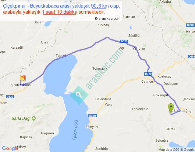 Çiçekpınar - Büyükkabaca arası yaklaşık olarak 90 km/h ile yukarıda belirtilen sürede olup, iki yerin kuş uçuşu uzaklığı (mesafesi) 60'dir. Yolculuk otobüsle 1 saat 31 dakika sürmektedir.