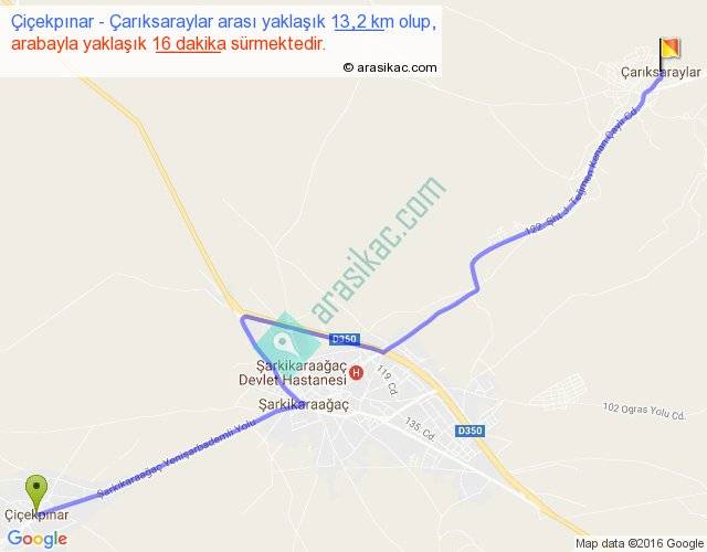 Çiçekpınar - Çarıksaraylar arası yaklaşık olarak 90 km/h ile yukarıda belirtilen sürede olup, iki yerin kuş uçuşu uzaklığı (mesafesi) 10'dir. Yolculuk otobüsle 20 dakika sürmektedir.